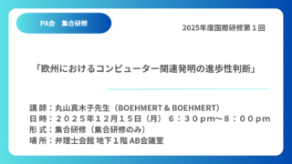 令和7年11月 吉 日 令和7年度 PA会研修部会担当幹事 谷水 浩一国際研修部門部会長 田中 有希企画担当 深津 拓寛鈴木 佑一郎 集合研修セミナー(国際研修第1回)「欧州におけるコンピューター関連発明の進歩性判 … 続きを読む [12月15日開催(集合研修)]国際研修第1回「欧州におけるコンピューター関連発明の進歩性判断」